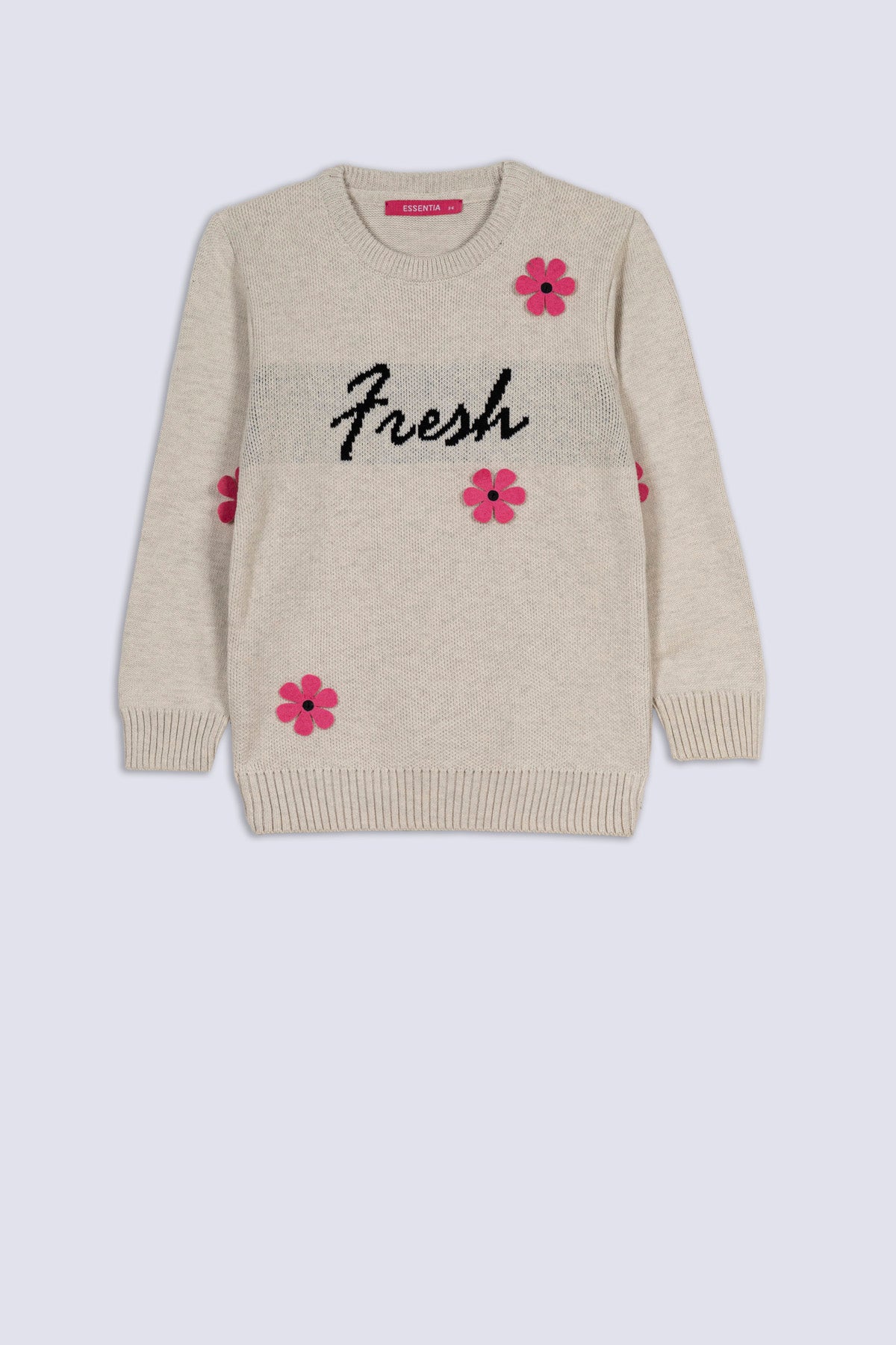 - Fabric: Soft-touch sweater crafted in oatmeal with vibrant pink flowers and a trendy slogan design.